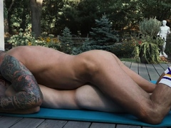 Outdoor muscled hunks enjoy bareback anal after rimming
