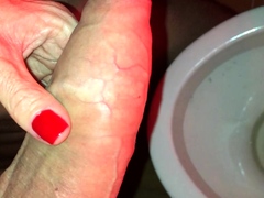 Slim ladyboy in white lingerie licks her own 9-inch cock